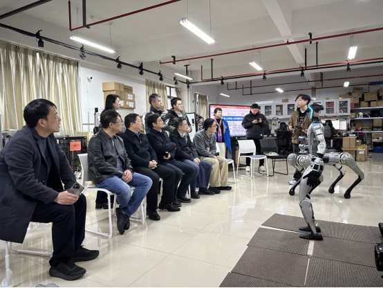 在随后的调研中,荣安华一行现场观摩了人形机器人、仿生机器狗的演示操作,深入了解了不同类型机器人在性能设计、应用场景及产业前景等方面的优势特点。来访嘉宾还亲身体验了人机交互系统,对前沿智能技术在服务、教育、康复等领域的广泛应用有了更加直观的认识,并对中心在人工智能与智能制造领域所取得的成果给予了高度评价。
