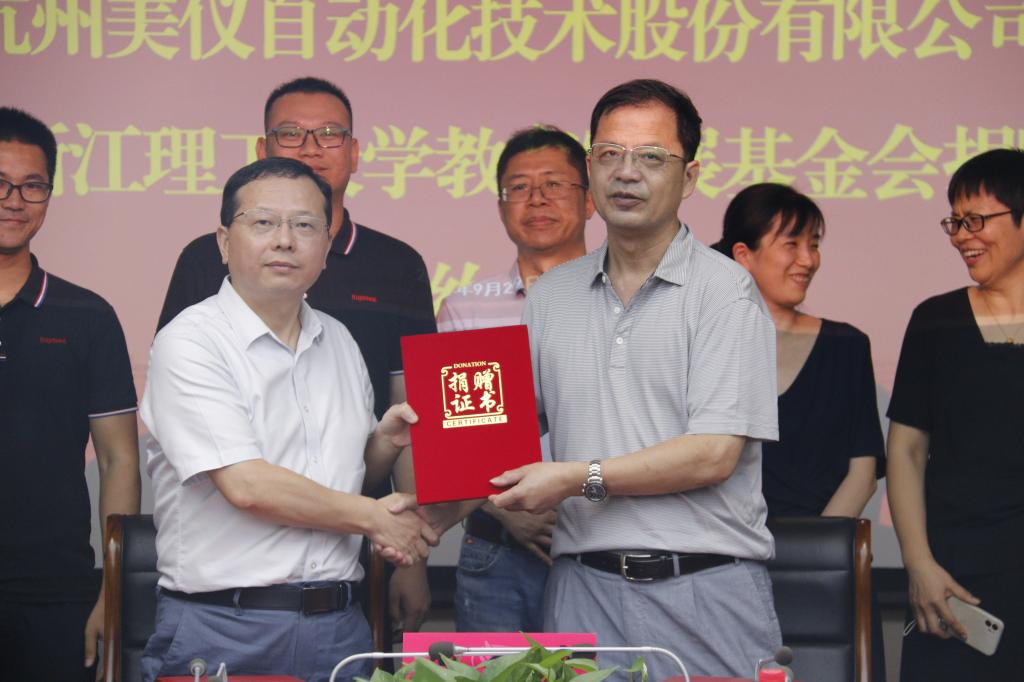 会上,杭州美仪自动化技术股份有限公司向学校捐赠人民币伍拾万元整,设立“美仪奖学金”。陈建勇与丁程签订捐赠协议,并为丁程颁发捐赠证书。