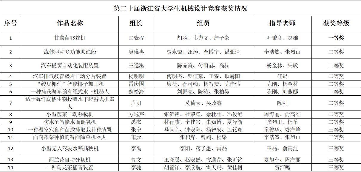 此次竞赛的主题为“创新未来制造、携手助农共富”,旨在培养新时代大学生的创新设计、综合设计能力和团队合作精神,提高全省高校大学生的机械设计水平,为浙江省高端装备制造业输送更多的人才。为此学院共选拔了24支队伍参加省赛初赛,最终16支队伍入围决赛参加现场评审。经成果展示和答辩,最终,共有14项作品获奖。