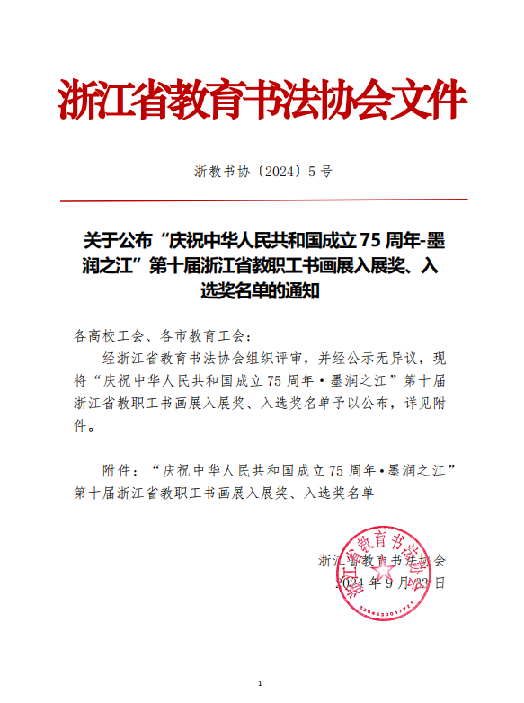 近日,由浙江省教育工会指导,浙江省教育书法协会主办的“庆祝中华人民共和国成立 75 周年·墨润之江”第十届浙江省教职工书画展作品征集工作已结束。经专家评审、公示和复核,av动漫