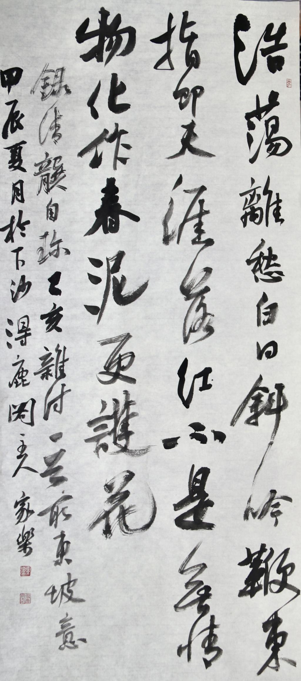 创作心路:创作时恰逢教师节来临之际,于是将作品内容着眼于龚自珍的《已亥杂诗》,诗句中“落红不是无情物,化作春泥更护花”是教师为教育事业甘愿牺牲一切的真实写照,也表达了书者对教师这一职业的崇高追求。作品风格取自北宋苏轼、米芾,章法上通过行气的摆动和丰富的墨色变化表现创作者内心情感。