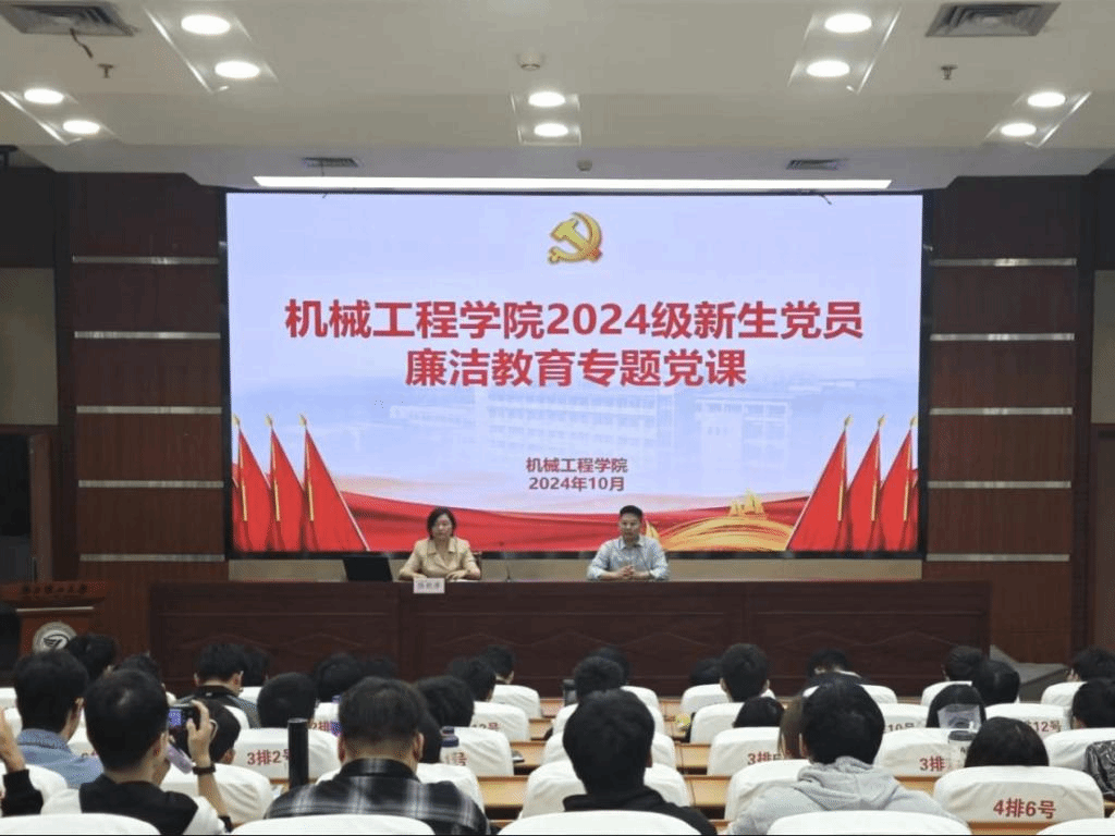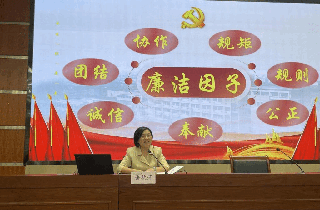 于10月22日下午在行政楼二楼报告厅举行第四季度廉洁教育“季季谈”活动。学院党委副书记、纪委书记陆秋萍出席并为全体2024级新生党员上廉洁教育专题党课,活动由学院党委组织员吴华雄主持。