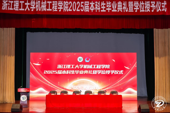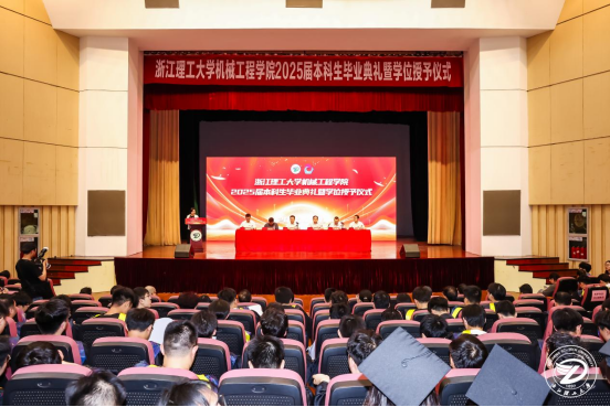 2025届本科生毕业典礼在学生活动中心小剧场举行。学院党政领导班子、各系主任、三办主任、毕业班班主任、教师代表、校友代表、全体辅导员、2025届全体本科毕业生及家长齐聚一堂,共同见证300余名学子圆满完成学业,从浙理机械扬帆启航。典礼由学院党委副书记、纪委书记陆秋萍主持。