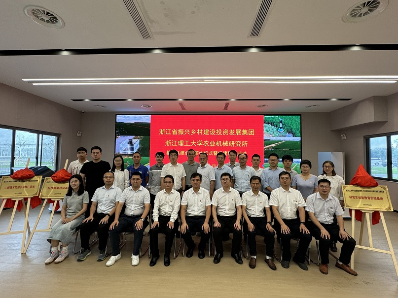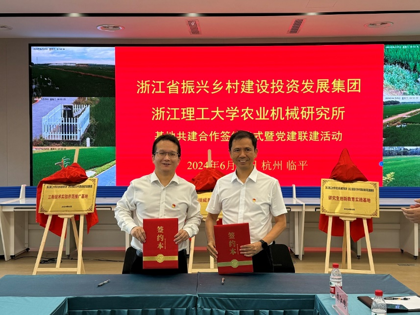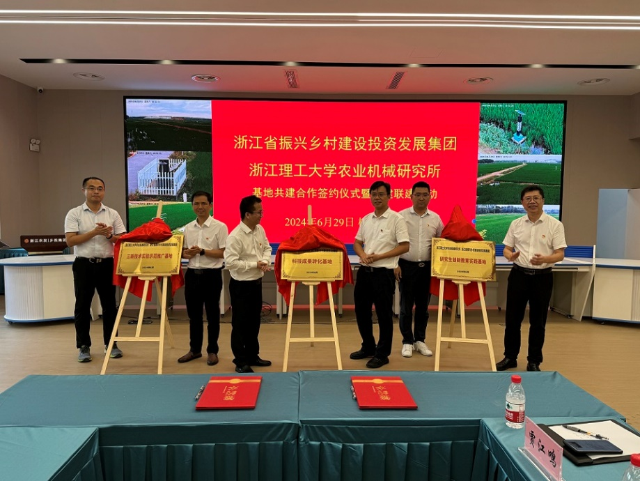 农业机械研究所、浙江省振兴乡村建设投资发展集团科技成果转化基地、三新技术实验示范推广基地、研究生创新教育实践基地的揭牌仪式。双方代表郑重签订科技成果转化基地、三新技术实验示范推广基地、研究生创新教育实践基地共建协议,并为基地揭牌。