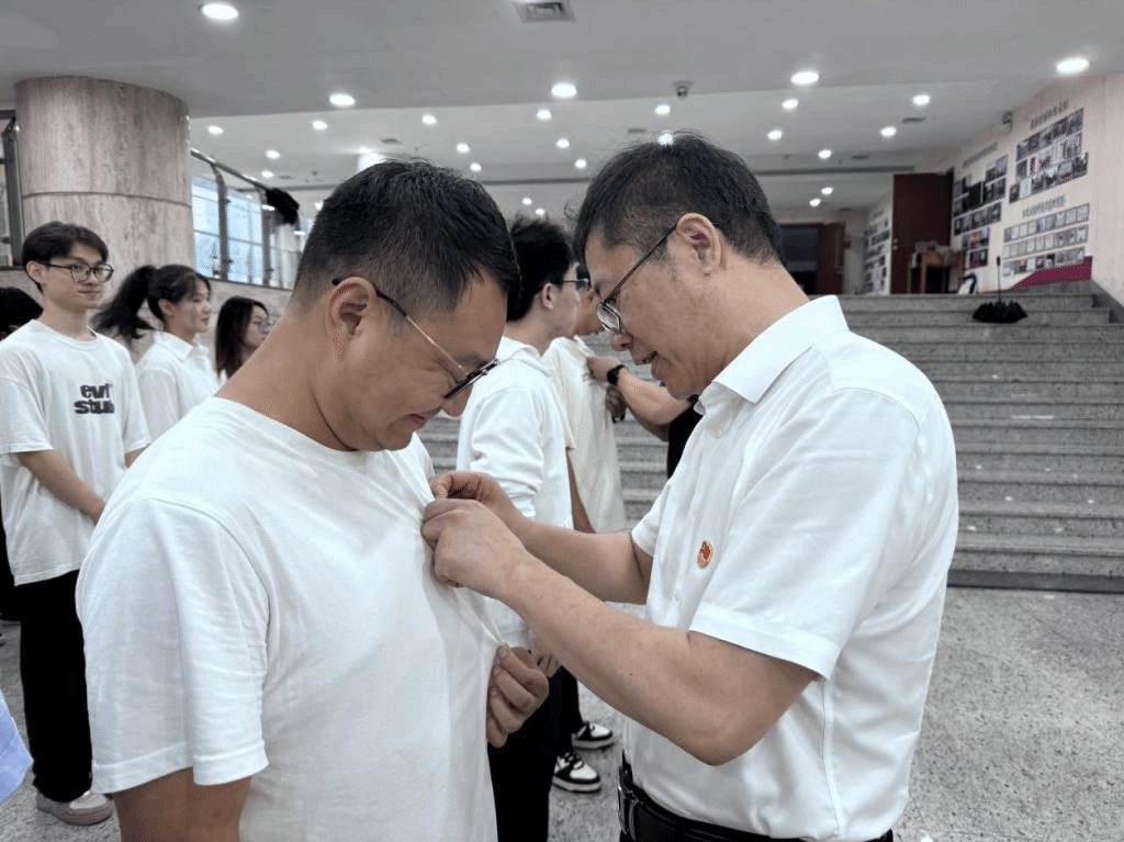 本年度共发展32名党员,其中教师2名,学生30名,在活动现场,苏志俭、鲁玉军、向忠及学生党支部书记代表为新发展的师生党员佩戴党员徽章,象征着党员的责任与使命薪火相传。
